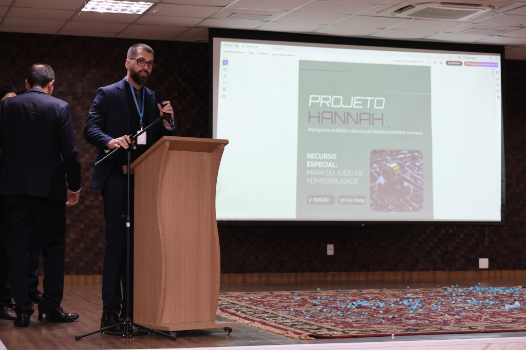 Desenvolvido pela Vice-Presidência do TJMT, a Hannah é um sistema de inteligência artificial voltado para o juízo de admissibilidade e está, neste momento, em fase experimental. A exibição foi feita pelo juiz auxiliar da Vice-Presidência, Gerardo Humberto Alves da Silva, acompanhado dos servidores Daniel Dock, Louise de Barros Ibarra e João Pedro Guerra.