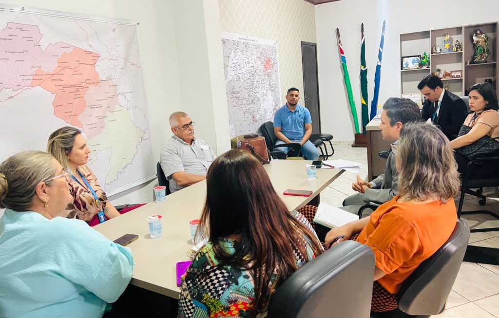 #Paratodosverem – Esta matéria possui recursos de texto alternativo para promover a inclusão das pessoas com deficiência visual. Representantes do município e do Poder Judiciário dialogam em reunião, sentados em cadeiras da cor preta, ao redor de uma mesa retangular bege. A sala tem paredes claras, com mapas do município fixados.