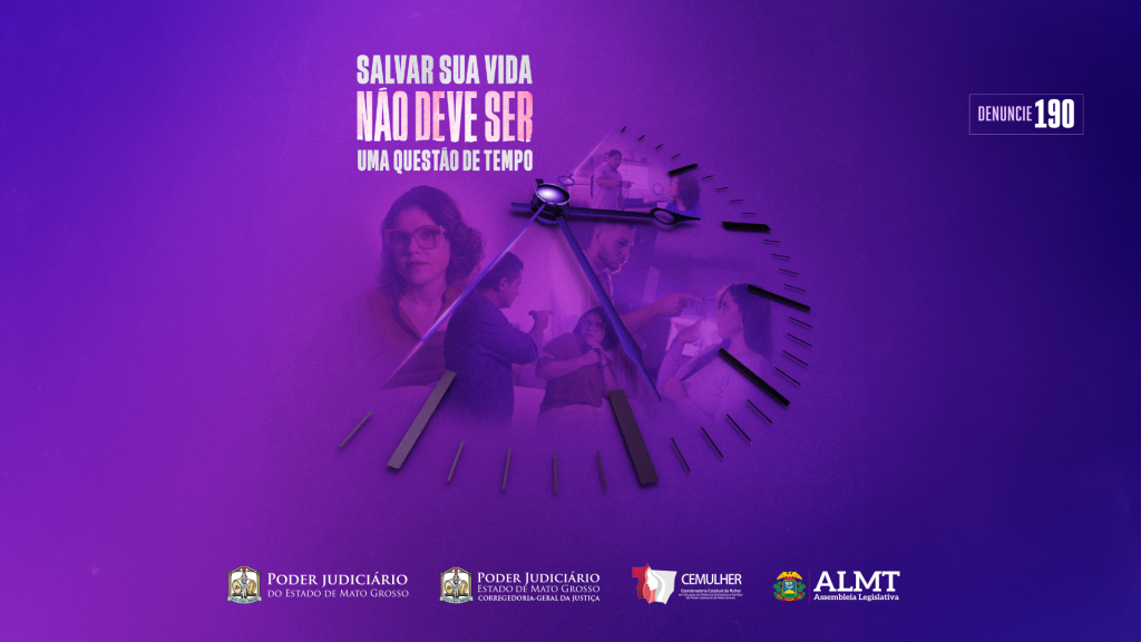 Esta matéria possui recursos de texto alternativo para promover a inclusão das pessoas com deficiência visual. Descrição de imagem: arte digital colorida na cor roxa. Ao centro a imagem de um relógio e ao fundo as cenas de mulheres sofrendo violência. À esquerda o texto “salvar sua vida não deve ser uma questão de tempo” e à direita um pequeno quadrante “denuncie 190”. Assinam a peça os logos do Poder Judiciário, da Corregedoria, da Cemulher e da Assembleia Legislativa.