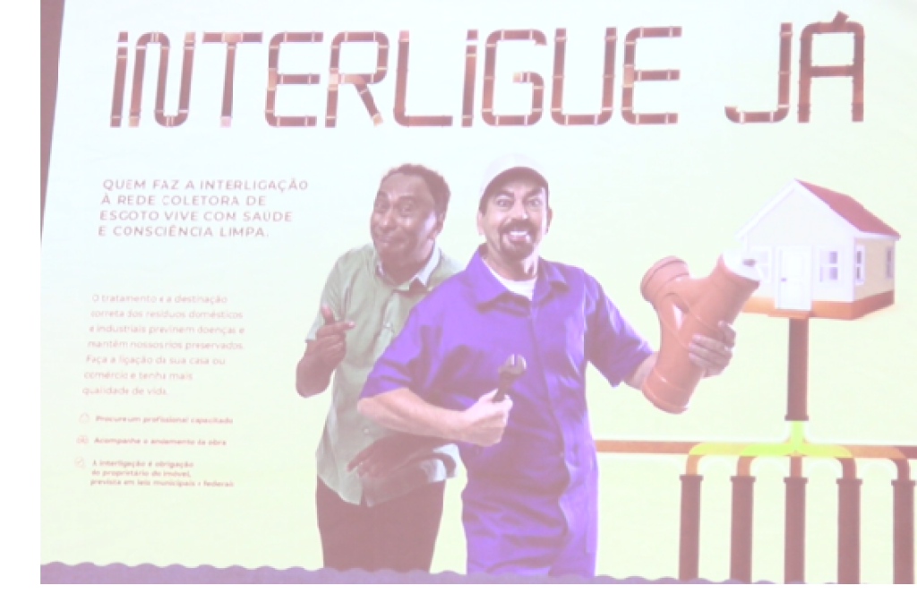 #Paratodosverem. Esta matéria possui recursos de texto alternativo para promover a inclusão das pessoas com deficiência visual. Descrição da imagem 1: foto colorida,da campanha de conscientização do projeto Interligue Já, aparece os humoristas Nico e Lau no cartaz com dizeres: Interligue Já: Quem faz a interligação à rede coletora de esgoto vive com saúde e consciência limpa. Abaixo textos sobre a importância do saneamento e tratamento adequado da água. Imagem 2- foto colorida, na horizontal, em que o desembargador Mário Kono assina o Termo de Cooperação, ao lado do magistrado, o desembargador Rodrigo Curvo e a representante do Ministério Público, Subprocuradora-Geral de Justiça Administrativa, Dra. Claire Vogel Dutra. Imagem 3: foto colorida do desembargador Rodrigo Curvo durante seu pronunciamento. Ele fala no púlpito em frente a mesa composta pelas autoridades e público presente. Imagem 4- foto colorida do juiz Antônio Horácio concedendo entrevista à TV.Jus.