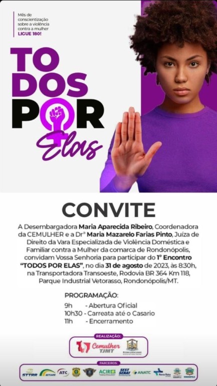 A Coordenadoria Estadual da Mulher em situação de violência de violência doméstica e familiar do Tribunal de Justiça de Mato Grosso (Cemulher/TJMT) realizará no dia 31 de agosto, em Rondonópolis, o 1º Encontro “Todos por Elas”. O evento encerrará a programação alusiva à campanha Agosto Lilás e será direcionado aos motoristas de transporte de cargas. A expectativa é que todas as transportadoras com sede no município participem do evento.