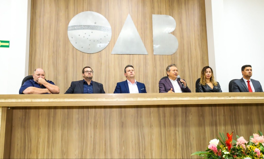 #ParaTodosVerem – Esta matéria possui recursos de texto alternativo para promover a inclusão das pessoas com deficiência visual. Descrição da imagem – autoridades dispostas lateralmente, sentadas a uma mesa e logomarca da Ordem dos Advogados do Brasil ao fundo.