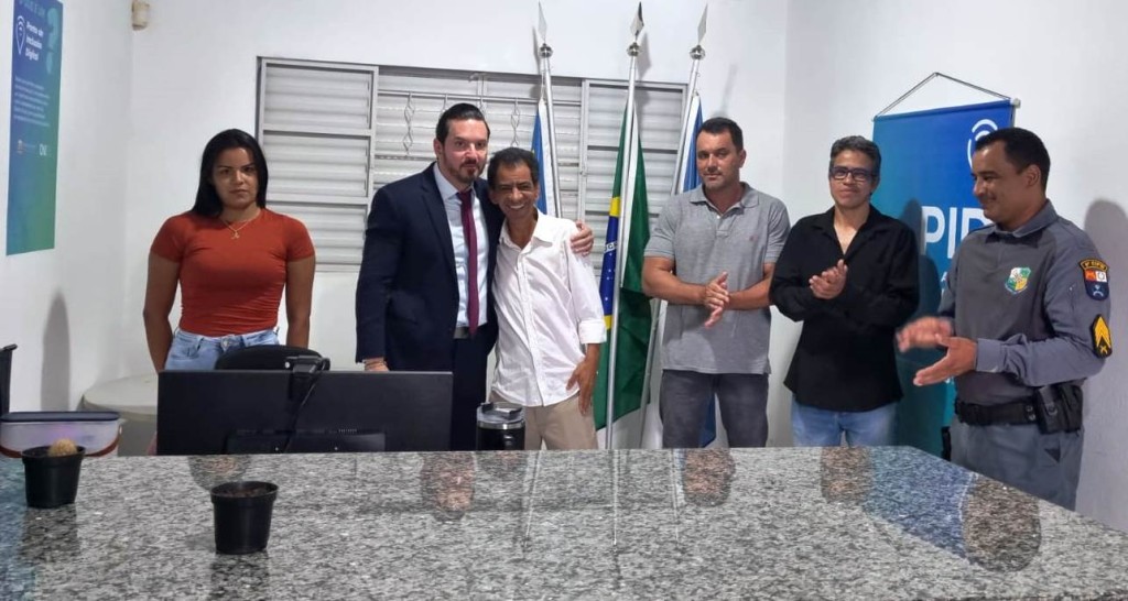 Esta matéria possui recursos de texto alternativo para promover a inclusão der pessoas com deficiência visual. Descrição da imagem: foto horizontal colorida das autoridades na inauguração do PID. Todos estão em pé na sala do PID, o juiz e o prefeito estão abraçados, os demais aplaudem. Há cinco homens e uma mulher. Ao fundo há bandeiras do Brasil, de Mato Grosso e do município.