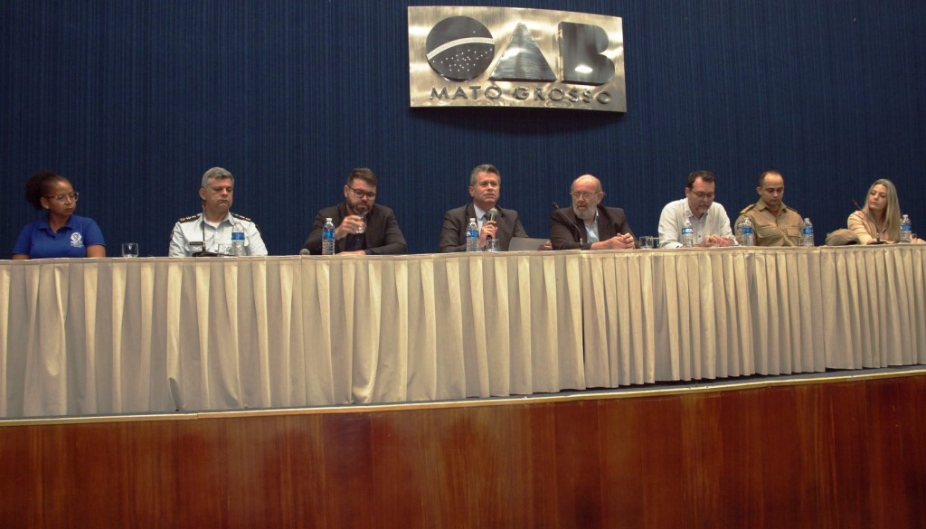 Esta matéria possui recursos de texto alternativo para promover a inclusão das pessoas com deficiência visual. Descrição da imagem 1: mesa composta pelas autoridades do evento, em que o juiz auxiliar da presidência está ao centro e fala ao público. Ele usa terno cinza camisa azul-clara, gravata com listras cinza e preta. Ao fundo aparece a logo da OAB-MT. I
