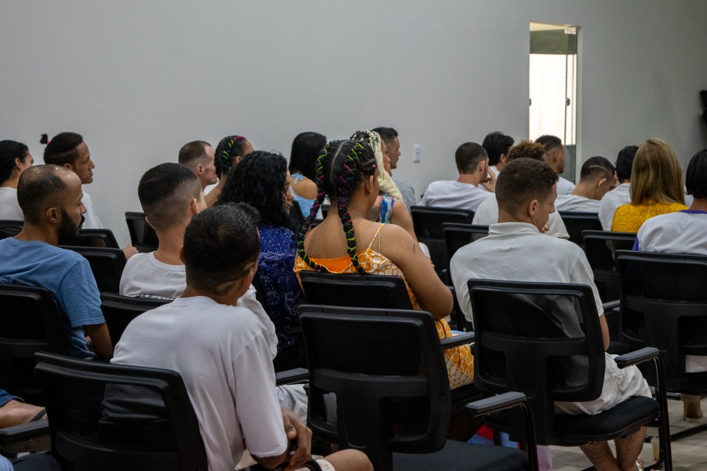 #ParaTodosVerem. Esta matéria possui recursos de texto alternativo para promover a inclusão das pessoas com deficiência visual. Foto 1:pessoas privadas de liberdade sentadas nas cadeiras do auditório, que está cheio. Algumas delas estão com tranças coloridas no cabelo. A maioria usa camiseta branca.