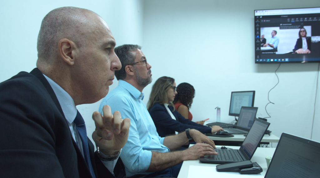 Esta matéria possui recursos de texto alternativo para promover a inclusão das pessoas com deficiência visual. Descrição da imagem: Foto 01: fotografia enquadra promotor, defensor público, juíza e estagiária lateralmente. Todos estão sentados, olhando para frente e prestam atenção em depoimento que está sendo prestado pela equipe técnica do Sistema Socioeducativo. O promotor é um homem branco que aparenta ter 50 anos, tem a cabeça raspada e está usando um terno azul escuro. O defensor é um homem branco que também aparenta ter 50 anos, possui barba e cabelos grisalhos, usa óculos e sua camisa é azul clara quadriculada. A juíza é uma mulher branca de cabelos longos com mechas loiras, usa óculos e está com um blazer azul escuro. A estagiária tem cabelos cacheados e usa vestido alaranjado. Todos têm um notebook a sua frente.