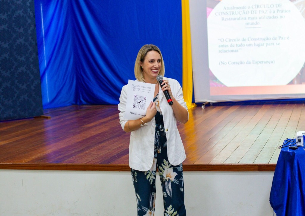 Círculo de Construção de Paz – A assessora especial da Presidência do TJMT, Katiane Boschetti da Silveira, explica que trata-se de uma metodologia baseada em ensinamentos ancestrais, ou seja, conversas baseadas no diálogo e no respeito, colocando em prática a justiça restaurativa. “É um convite para olharmos para os conflitos de uma forma diferente. Olhar os conflitos como oportunidade de transformação, entendendo que a Justiça é um conjunto de princípios e valores e não necessariamente uma instituição é responsável por ela. E os círculos de construção de paz como prática da justiça restaurativa no ambiente escolar proporcionam que a gente possa se conhecer mais, oportunizar espaços de escuta, de pertencimento para essas crianças e adolescentes, visando a prevenção da violência”, explica.
