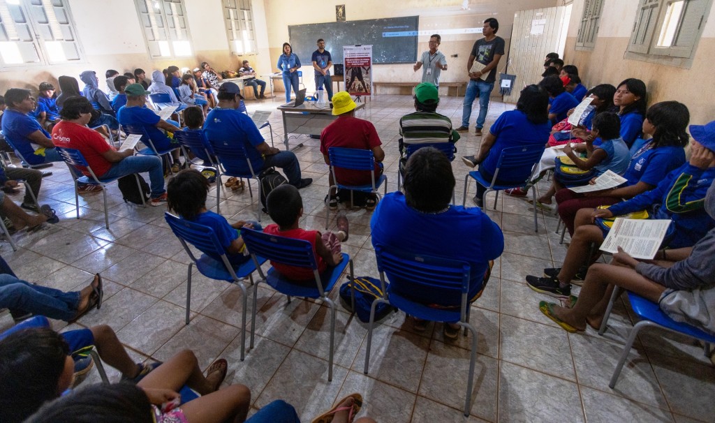 Primeira imagem: plano geral dos alunos indígenas sentados em um grande salão paroquial. Ao fundo, em pé, integrantes do Poder Judiciário falam a todos os presentes.
