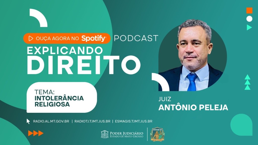 Esta matéria possui recursos de texto alternativo para promover a inclusão das pessoas com deficiência visual. Descrição: Fotografia retangular e colorida. Na lateral esquerda o texto ‘Ouça agora no Spotify!’. No canto superior direito a palavra Podcast. No centro, o nome do programa, com a foto do convidado, o tema do programa – Intolerância religiosa – e o nome do convidado – juiz Antônio Peleja. Na parte inferior os endereços eletrônicos da Rádio Assembleia, Rádio TJ e Escola da Magistratura. Assina a peça o logo do Poder Judiciário de Mato Grosso e da Esmagis-MT.
