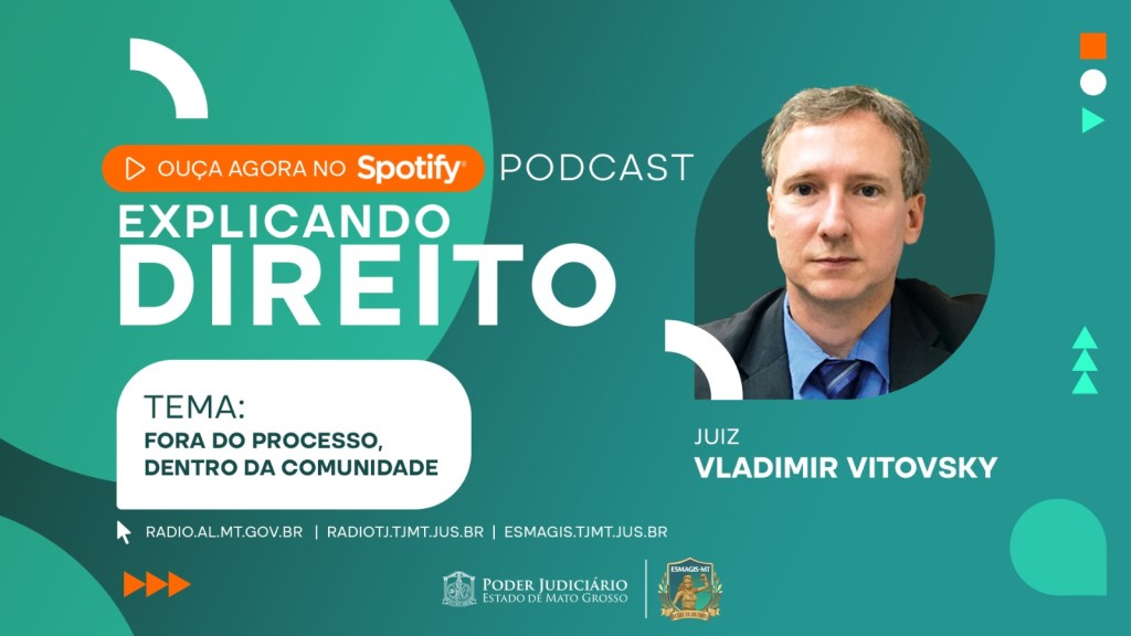 ParaTodosVerem: Essa matéria possui recursos de texto alternativo para promover a inclusão das pessoas com deficiência. Fotografia quadrada e colorida. Na lateral esquerda o ícone de play acompanhado do texto: Ouça agora no Spotify. Na parte superior central o logo do Programa Explicando Direito, a foto do convidado, com o tema da palestra e nome do magistrado, juiz Vladimir Vitovsky. Assina a peça a logo do Poder Judiciário de Mato Grosso e da Esmagis-MT.
