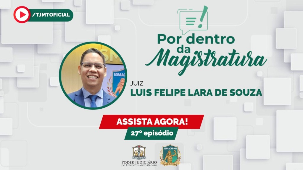 #ParaTodosVerem – Esta matéria possui recursos de texto alternativo para promover a inclusão das pessoas com deficiência visual. Peça publicitária colorida. Na lateral esquerda o ícone de play acompanhado do texto: /tjmtoficial. Na parte superior central o logo do Programa Por Dentro da Magistratura e a foto do juiz Luiz Felipe Lara de Souza, acompanhados do texto: Juiz Luiz Felipe Lara de Souza Assista agora! 27º Episódio. Assina a peça o logo do Poder Judiciário de Mato Grosso.