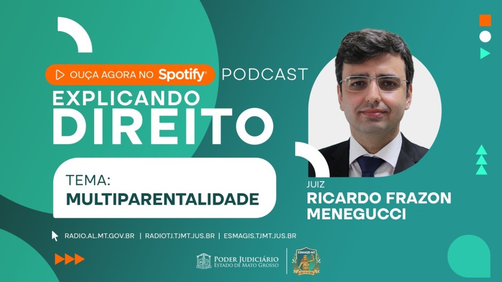 #ParaTodosVerem – Esta matéria possui recursos de texto alternativo para promover a inclusão das pessoas com deficiência visual. Descrição: peça publicitária retangular e colorida. Na lateral esquerda, o texto ‘Ouça agora no Spotify!’, seguido da palavra Podcast. No centro, o nome do programa Explicando Direito, com foto e nome do convidado, Ricardo Frazon Menegucci, bem como o tema Multiparentalidade. Na parte inferior, os endereços eletrônicos da Rádio Assembleia, Rádio TJ e Escola da Magistratura. Assina a peça o logo do Poder Judiciário de Mato Grosso e da Esmagis-MT.