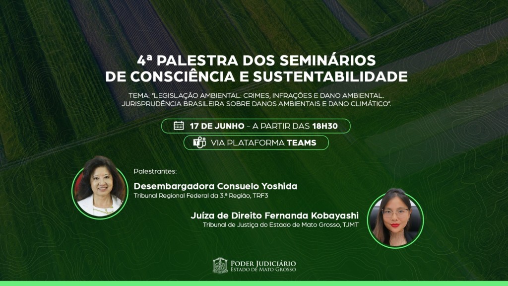 Esta matéria possui recursos de texto alternativo para promover a inclusão das pessoas com deficiência visual. Descrição de imagem: arte gráfica digital colorida. Ao fundo imagem aérea de uma plantação com aplicação de filtro em tom verde. Acompanha o texto: 4ª Palestra dos Seminários Consciência e Sustentabilidade. Tema: “Legislação Ambiental: Crimes, Infrações e Dano Ambiental. Jurisprudência Brasileira sobre Danos Ambientais e Dano Climático” | 17 de junho – a partir das 18h30. Via Plataforma Teams. Abaixo dois ícones com as fotos das palestrantes em um círculo verde. Desembargadora Consuelo Yoshida Tribunal Regional Federal da 3ª Região, TRF3 e juíza de Direito Fernanda Kobayashi Tribunal de Justiça do Estado de Mato Grosso, TJMT. Ambas são mulheres brancas com traços japoneses e cabelo liso escuro. Fernanda usa óculos e batom vermelho. Assina a peça o logo do Poder Judiciário do Estado de Mato Grosso.