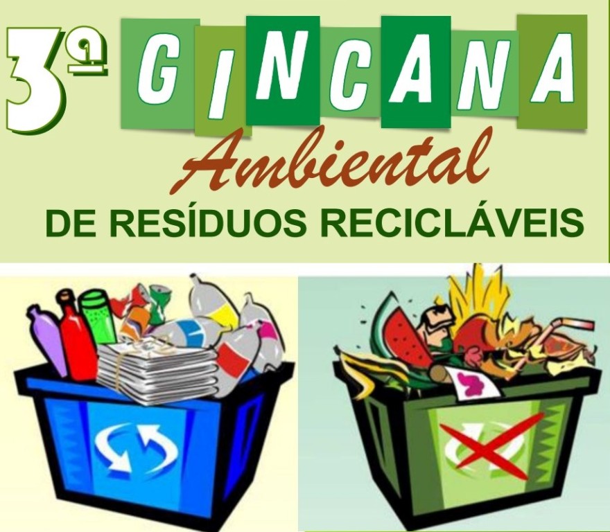Descrição da imagem: arte colorida. Ilustração em formato quadrado com destaque para o nome do evento, 3ª Gincana Ambiental de resíduos Recicláveis, e duas caixas coletoras de objetos recicláveis e não recicláveis.