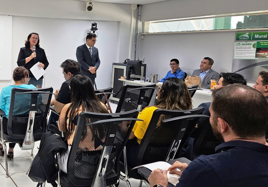 #Paratodosverem. Esta matéria possui recursos de texto alternativo para promover a inclusão das pessoas com deficiência visual. Fotografia colorida retratando o momento em que a diretora-geral da Esmagis fala aos participantes. Ela está em pé, segura o microfe com uma mão, com a outra segura uma folha de papel. Os participantes estão sentados e olharam para a diretora-geral da Esmagis.