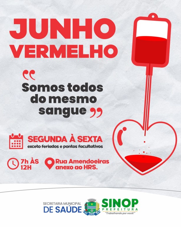 Um novo mês, uma nova cor! O junho vermelho é dedicado ao fortalecimento da campanha de doação de sangue, com objetivo de buscar novos voluntários doadores. Em Sinop, a Unidade de Coleta e Transfusão (UCT) recebe em média 300 doações por mês. Doações que abastecem o banco de sangue dos Hospitais da cidade e da região.