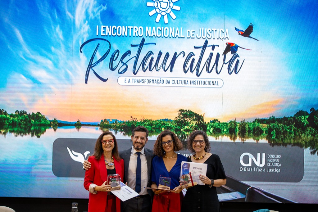 Esta matéria possui recursos de texto alternativo para promover a inclusão das pessoas com deficiência visual. Primeira imagem: fotografia em plano aberto mostra os participantes do painel, três mulheres e um homem em pé. Todos estão sorrindo. As mulheres seguram um certificado e uma caixinha transparente com uma lembrança do evento. Atrás deles aparece o telão com a imagem da marca do evento, mostrando o desenho de um rio, com vegetação e o céu onde voam duas araras. Na mesma imagem se lê 1º encontro Nacional de Justiça Restaurativa e a Transformação da Cultura Institucional. No canto direito inferior lê-se CNJ – Conselho Nacional de Justiça – O Brasil faz a Justiça. Segunda imagem: Os quatro participantes do painel estão sentados em cadeiras. As três mulheres olham para o presidente do painel, Juiz Marcelo Nalesso, que segura o microfone e gesticula com a mão esquerda. Atrás dos painelistas está o telão com a imagem do evento onde se lê o nome dos parceiros do evento e suas logos: Nugjur, Poder Judiciário de Mato Grosso e CNJ. Em primeiro plano, estão os espectadores sentados e de costas para a câmera.