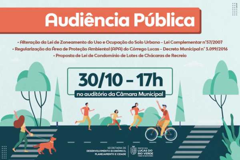 A Prefeitura de Lucas do Rio Verde, por meio da Secretaria de Desenvolvimento Econômico, Planejamento e Cidade, realizará na segunda-feira, 30 de outubro, uma audiência pública para tratar de três temas: Lei de Zoneamento do Uso e Ocupação do Solo Urbano, Regularização da Área de Proteção Ambiental (APA) do Córrego Lucas e a criação da Lei de Condomínios de Lotes de Chácaras de Recreio.