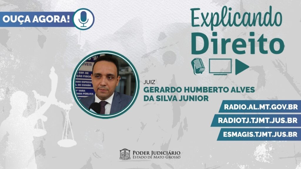 lateral esquerda o texto ‘Ouça agora!’. No canto superior direito a logo do Programa Explicando Direito. No centro, a foto do convidado. Texto: Gerardo Humberto da Silva Júnior. No canto inferior direito os endereços eletrônicos da Rádio Assembleia, Rádio TJ e Escola da Magistratura. Assina a peça o logo do Poder Judiciário de Mato Grosso.