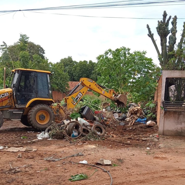 A imagem mostra uma retroescavadeira amarela fazendo a retirada de detritos de um bolsão de lixo localizado no bairro Nova Esperança I. No local, há restos de poda de árvores, pneus, sofás e lixo doméstico. O chão é de terra batida na coloração avermelhada. Existem árvores ao fundo.