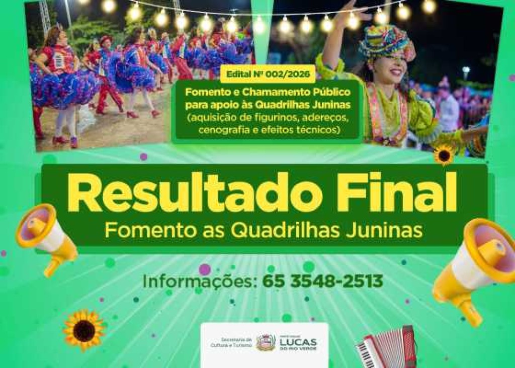A Prefeitura de Lucas do Rio Verde, por meio da Secretaria Municipal de Cultura e Turismo, publicou nesta quinta-feira (05) o resultado final dos projetos inscritos no Edital de Seleção nº 002 de Fomento às Quadrilhas Juninas. O chamamento público tem como objetivo apoiar financeiramente iniciativas culturais voltadas à aquisição e confecção de figurinos, adereços, cenários e efeitos técnicos para espetáculos de quadrilhas juninas no município.