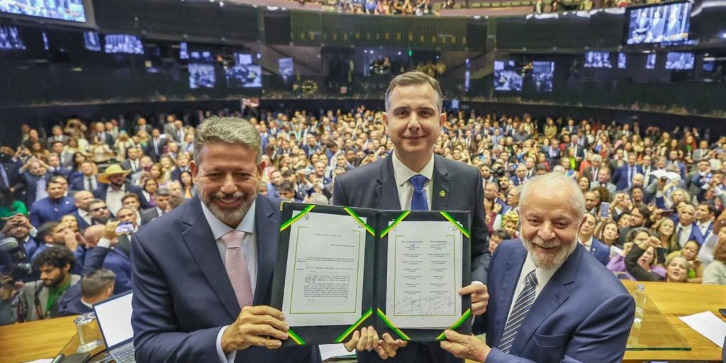 A votação do texto havia sido concluída pela Câmara dos Deputados no último dia 15. Lula compareceu à cerimônia, realizada no Plenário da Câmara, que também contou com as presenças do presidente do Senado e Congresso, Rodrigo Pacheco (PSD-MG); da Câmara dos Deputados, Arthur Lira (PP-AL); e do Supremo Tribunal Federal (STF), Luís Roberto Barroso, além dos ministros Fernando Haddad (Fazenda) e Simone Tebet (Planejamento), e centenas de deputados e senadores.