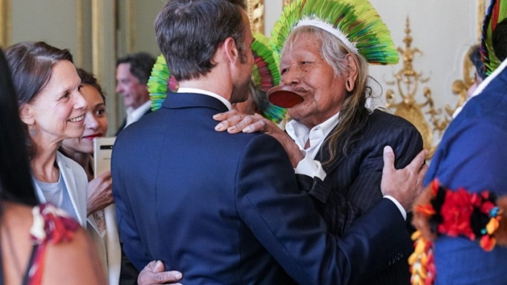 O presidente da França, Emmanuel Macron, se encontrou neste domingo (4) com o cacique Raoni, de 93 anos, ativista da luta pela defesa da Amazônia e dos povos indígenas.