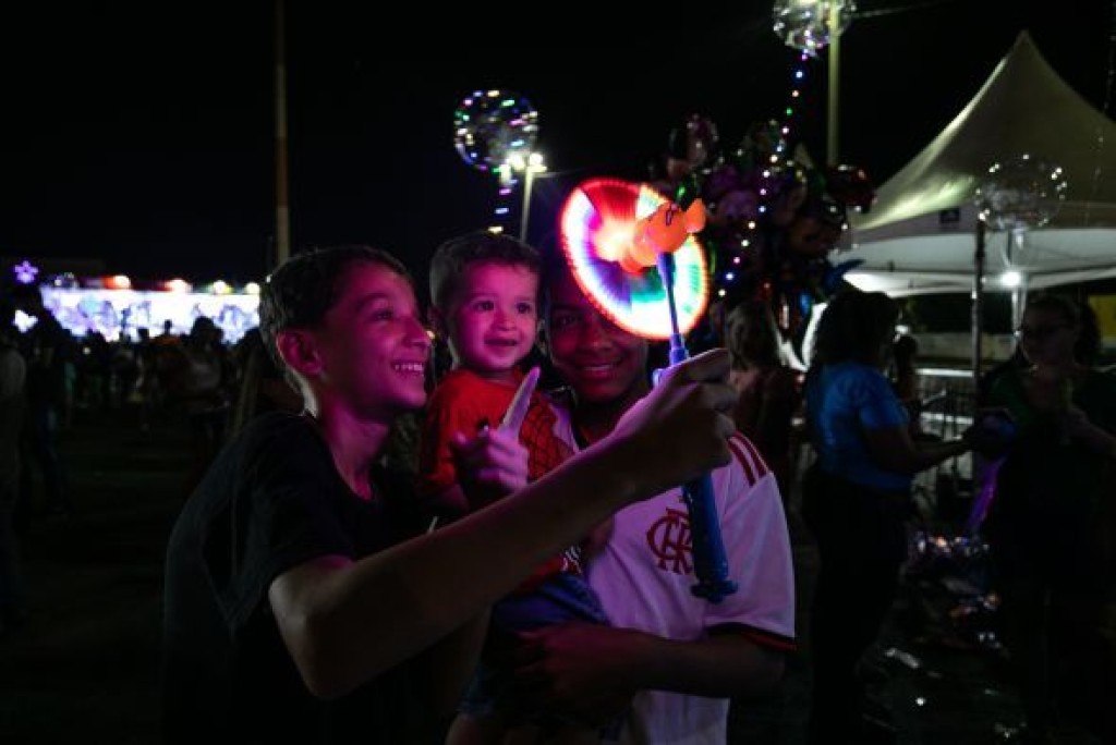 Os filhos de Loiuise fizeram parte das mais de mil crianças que participaram do Natal da Gente 2023, realizado na Praça Cultural do Parque Cuiabá na quarta-feira (13). Festa que foi realizada pela Prefeitura de Cuiabá por meio da Secretaria Municipal de Cultura, Esporte e Lazer. “Hoje eu vi meus filhos felizes, estou esperando o Papai Noel. São muitas crianças, mas é maravilhoso”, brincou Louise, a mãe dos pequenos.