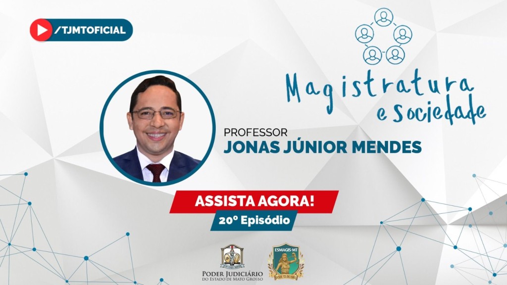 Esta matéria possui recursos de texto alternativo para promover a inclusão das pessoas com deficiência visual. Peça publicitária colorida com foto de homem. Texto: Magistratura e Sociedade – Convidado Jonas Júnior Mendes – assista agora! 20ª edição. Assina a peça o logo do Poder Judiciário de Mato Grosso.