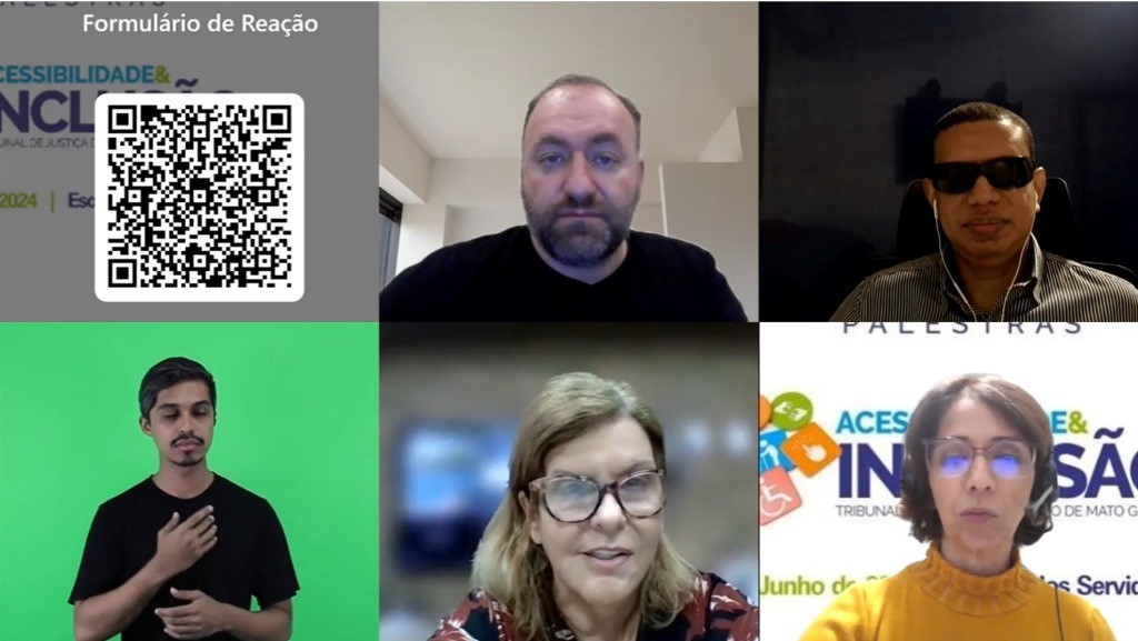 #Paratodosverem. Esta matéria possui recursos de texto alternativo para promover a inclusão das pessoas com deficiência visual. Descrição da imagem: A imagem é um print de tela e mostra os palestrantes, o tradutor de Libras, a desembargadora Nilza Maria e a servidora Luciana, da Escola dos Servidores. Eles aparecem em quadrados, lado a lado. No canto esquerdo da tela aparece o QRCode para a pesquisa de reação.