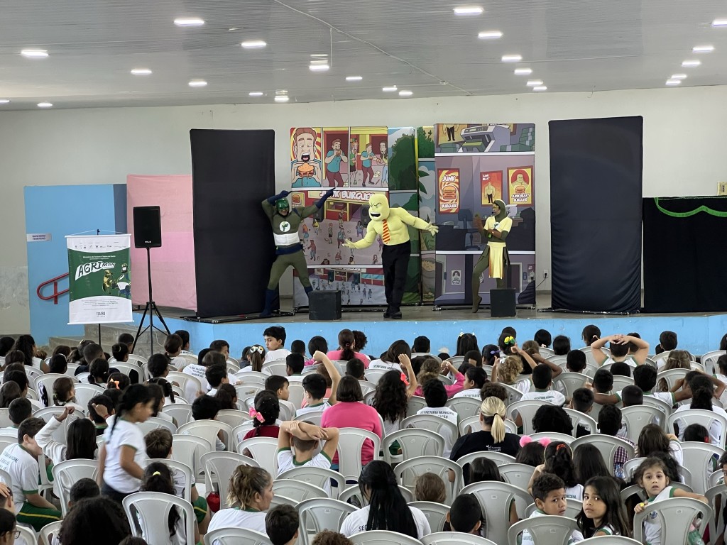 Mais de 700 crianças do 3º ao 5º ano das escolas públicas municipais assistiram, nesta segunda-feira (27.03) no Centro de Eventos Juarez de Abreu, o espetáculo teatral “Agriman Agriventuras”. Por meio da peça, as crianças conheceram os super-heróis Agriman e Photosynthesista, que mostraram a importância de uma alimentação saudável.