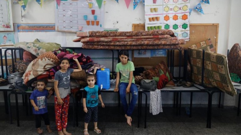 No último dia 8 de outubro, crianças palestinas aguardam dentro de um quarto em um abrigo de emergência na Faixa de Gaza