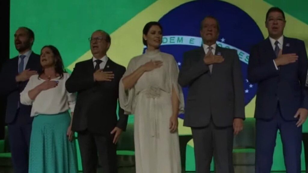 O ex-mandatário participou do evento por videoconferência e se emocionou ao falar de Michelle. Ele ainda disse que gostaria de estar no Brasil ao lado da esposa e da família. Bolsonaro faz 68 anos nesta terça, após a mensagem ele foi aplaudido e ganhou um “parabéns a você”, puxado pela esposa.