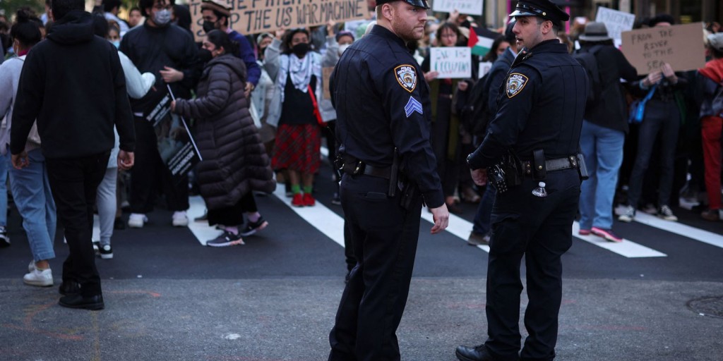 A polícia da cidade de Nova York estava em peso, mantendo um perfil altamente visível atrás de barreiras à beira da manifestação barulhenta, mas pacífica, na Times Square, enquanto milhares de pessoas gritavam, tocavam tambores e agitavam bandeiras e cartazes pró-palestinos.