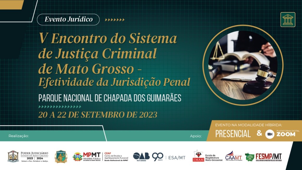 Esta matéria possui recursos de texto alternativo para promover a inclusão das pessoas com deficiência visual. Peça publicitária colorida. À direita imagem de símbolos da justiça sobre uma mesa. Texto: Evento híbrido. V Encontro do Sistema de Justiça Criminal de Mato Grosso – Efetividade da Jurisdição Penal. Parque Nacional de Chapada dos Guimarães. 20 a 22 de setembro de 2023.