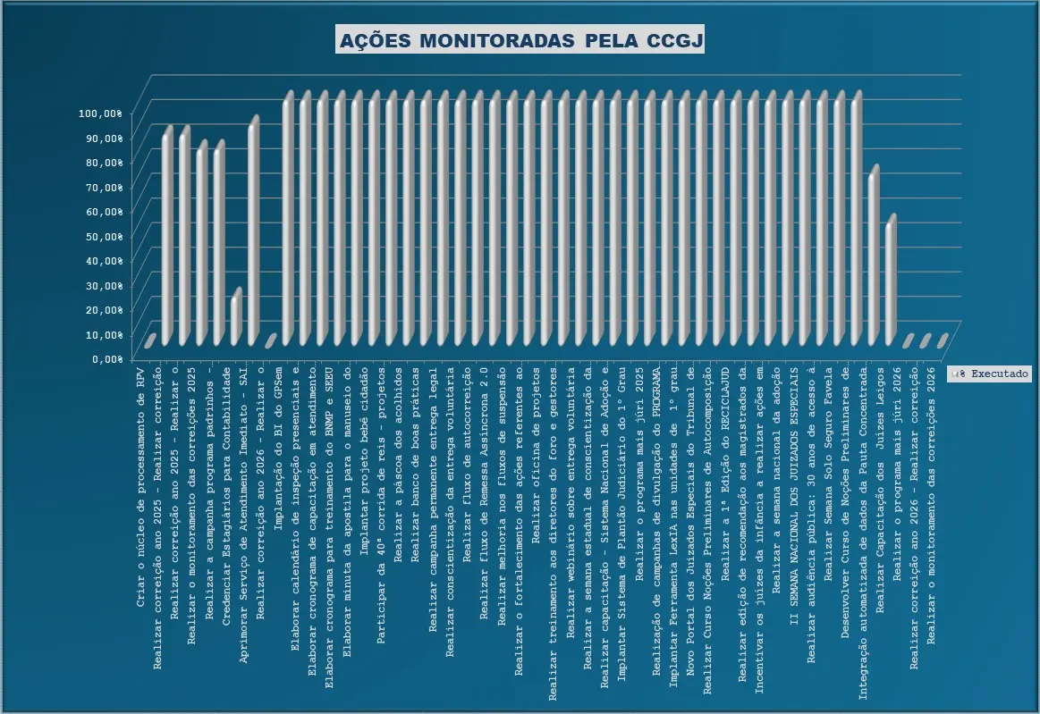 Do total de ações monitoradas pela CCGJ, seis estão em andamento, com percentuais de execução entre 80% e 90%. Essas atividades envolvem rotinas contínuas de acompanhamento, consolidação de dados, capacitações e processos que se estendem ao longo da gestão.