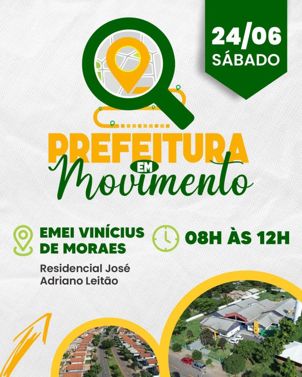 Todos os meses a Prefeitura de Sinop leva diversos atendimentos das secretarias municipais, do gabinete do prefeito, bem como atividades e projetos de cultura, esporte e lazer, para mais perto da comunidade de alguma região do município, através do projeto itinerante “Prefeitura em Movimento”. A edição deste mês será neste sábado (24), com oferta dos serviços no Residencial José Adriano Leitão, para os moradores do bairro e das proximidades, na Emei Vinícius de Moraes, das 8h às 12h.