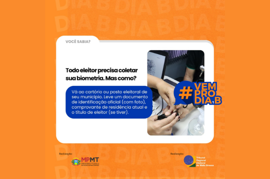 O Tribunal Regional Eleitoral de Mato Grosso (TRE-MT) promove nesta sexta-feira (6) o “Dia B”, uma ação de incentivo ao cadastramento biométrico de eleitores no estado. Do total de 2.465.432 pessoas aptas ao voto em Mato Grosso, 1.968,04, ou seja, 79,83% já cadastraram a digital junto à Justiça Eleitoral. Dessa forma, 497.388, isto é, 20,17% ainda precisam fazer a coleta biométrica.