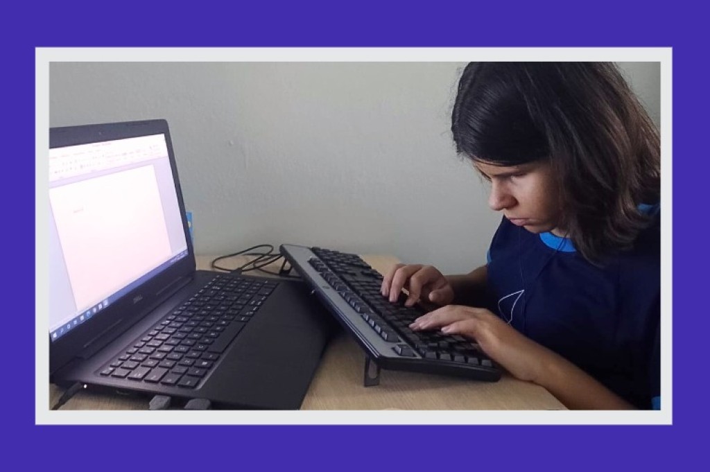 Ana Luiza Corrêa Calabria, de 11 anos, é deficiente visual. Quadrigêmea, ficou cega após desenvolver a doença ocular retinopatia da prematuridade (descolamento da retina provocado pelo desenvolvimento anormal de vasos sanguíneos) logo nos primeiros meses de vida. Hoje, estuda em uma escola particular regular ao lado dos irmãos, onde recebe o apoio de uma acompanhante especializada. No contraturno, frequenta o Instituto dos Cegos de Mato Grosso, em Cuiabá.