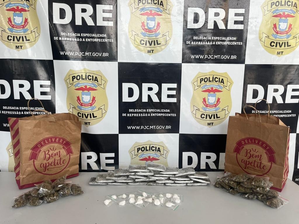 Durante monitoramento da região, os policiais localizaram o veículo e realizaram a abordagem da suspeita que foi flagrada em posse de 23 porções de maconha, armazenadas em envelopes de plástico, 24 minitabletes de maconha e 18 porções de cocaína, além de R$ 100 em dinheiro. A droga estava dentro de sacolas de entrega de delivery.