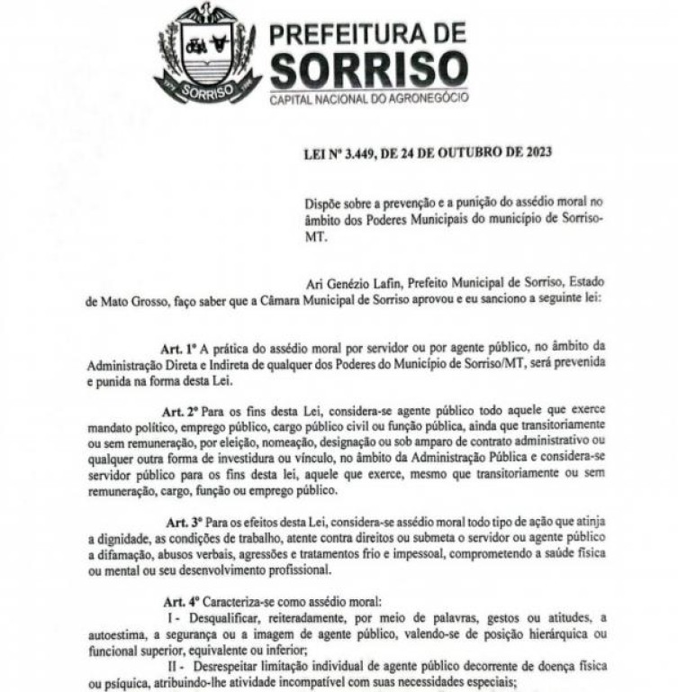Foi publicada no dia 24 de outubro a Lei Municipal 3.449/2023 que trata e estabelece o que é assédio ao servidor público no ambiente e horário de trabalho. Itens como o que é assédio moral; como proceder em caso de assédio; ações punitivas em relação a quem pratica o ato; e, mecanismos de amparo que visam restabelecer a saúde emocional e também física de quem é assediado são detalhadas no processo.