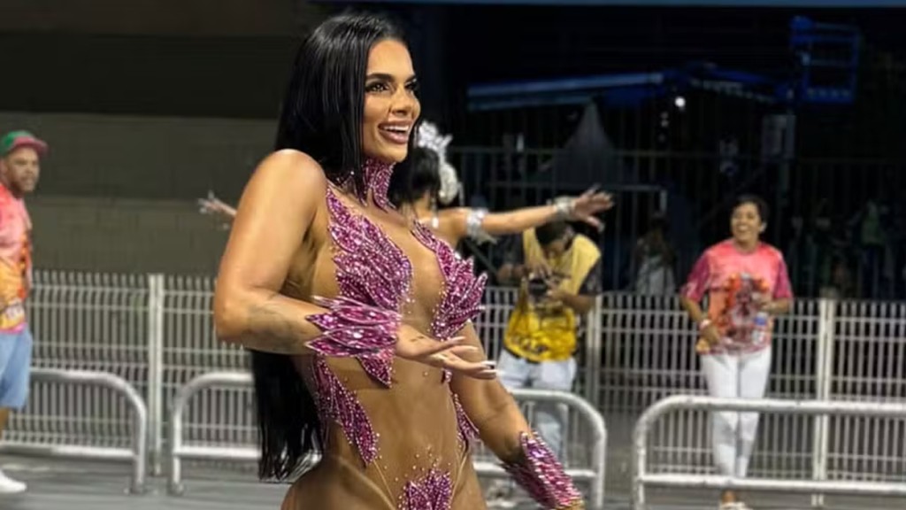 A empresária apostou em um body transparente com pedrarias na cor lilás, que cobriam suas partes íntimas, busto e parte do pulso.