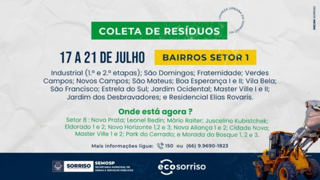 Na próxima semana, entre os dias 17 e 21 de julho, a Prefeitura, por meio da Secretaria de Obras e Serviços Públicos (Semosp), fará a quarta rodada deste ano da coleta de resíduos sólidos nos bairros que integram o Setor 1: Industrial 1 e 2; São Domingos; Fraternidade; Verdes Campos; Novos Campos; São Mateus; Boa Esperança 1 e 2; Vila Bela; São Francisco; Estrela do Sul; Jardim Ocidental; Jardim dos Desbravadores; e Elias Rovaris.