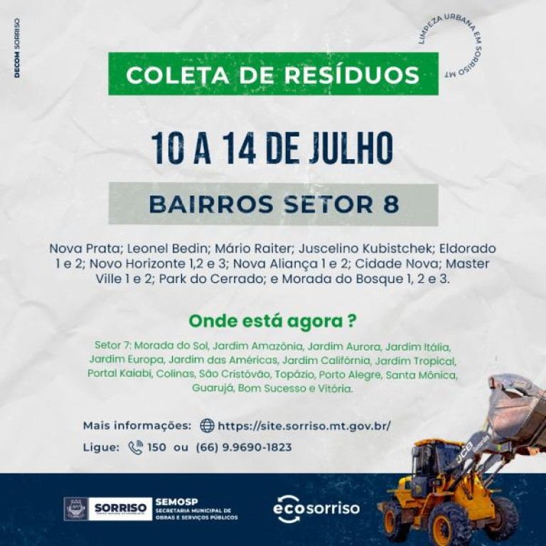 Coleta de Resíduos Sólidos: é esta que vai para o Setor 8 na semana que vem! Nesta modalidade, feita, mais ou menos, a cada dois meses, de acordo com calendário específico, são retirados itens como eletrodomésticos velhos e inservíveis e os resíduos sólidos provenientes da limpeza de jardim.