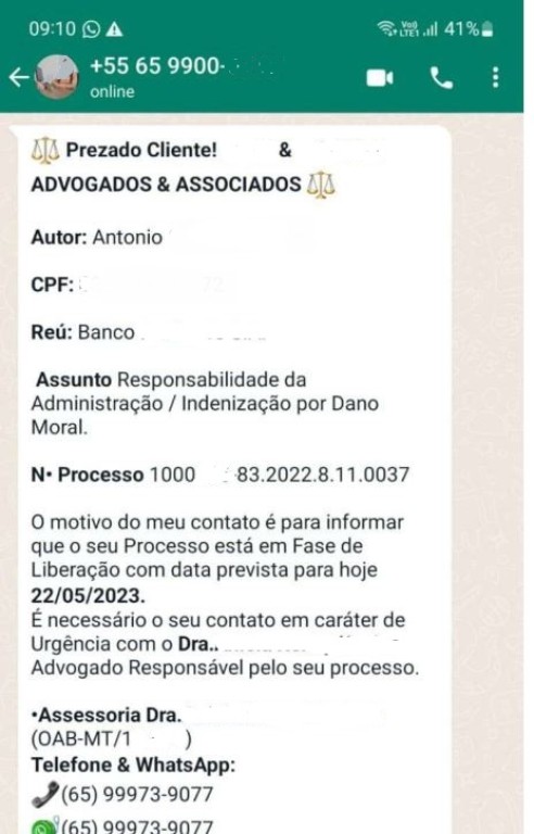 Advogados e sociedade devem ficar atentos para não ser vítimas de criminosos que estão usando o nome da Central de Precatórios do Tribunal de Justiça de Mato Grosso (TJMT) para aplicar golpes. A prática consiste no envio de mensagens via WhatsApp com pedido de pagamento de guias falsas de suposto processo. A prática desta ação fraudulenta é antiga, mas sempre é utilizada pelos estelionatários para roubar dinheiro de possíveis vítimas.