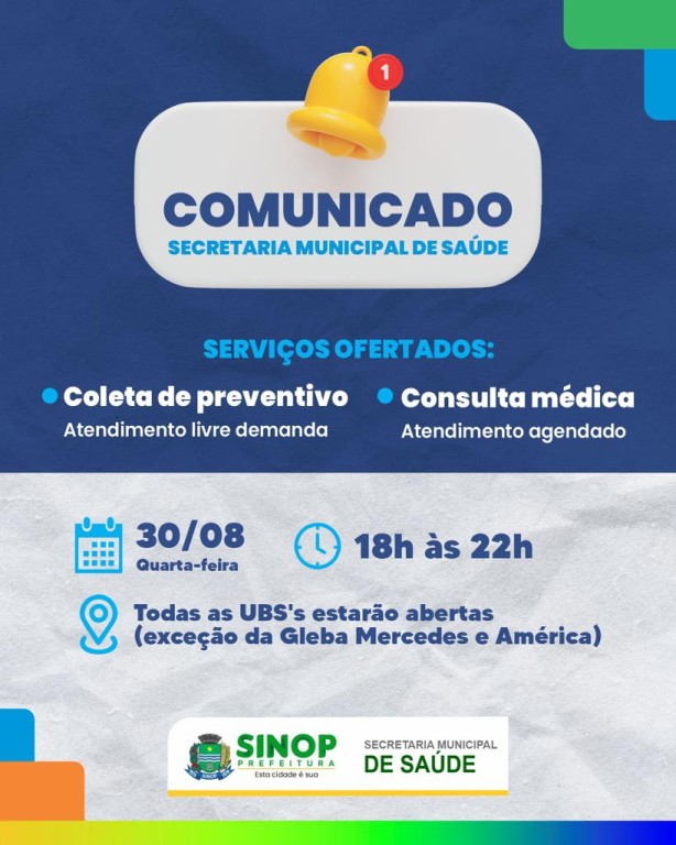 A Prefeitura de Sinop, por meio da Secretaria de Saúde, fará nesta quarta-feira (30), mais uma ação com horário estendido nas UBS’s, onde serão ofertados coleta de preventivo (papanicolau) com atendimento livre demanda e consulta médica com agendamento, das 18h às 22h.