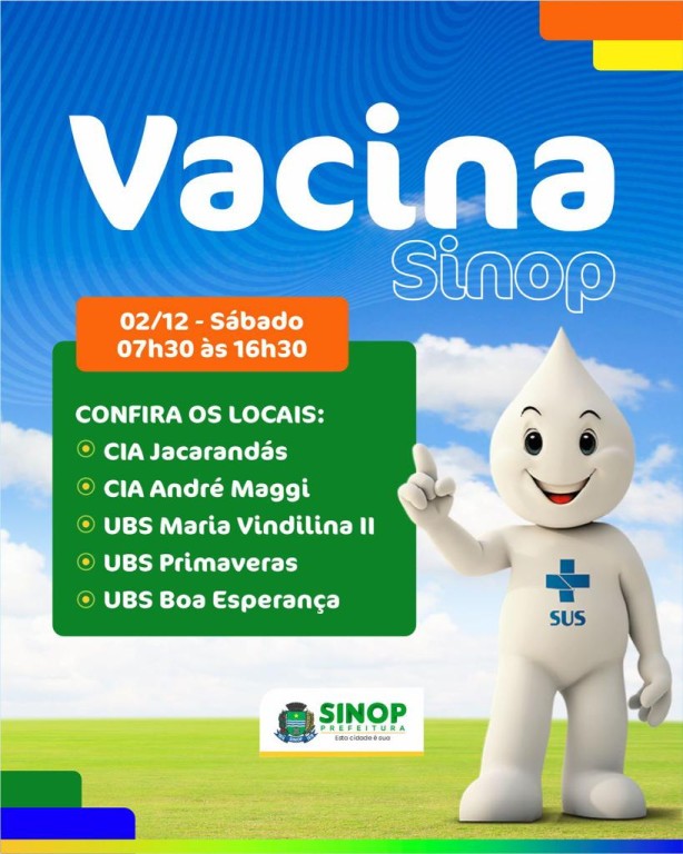 No sábado, as salas de vacinação dos Centros Integrados de Atendimento (CIA’s) Jacarandás e André Maggi, juntamente com as Unidades Básicas de Saúde (UBS’s) dos bairros: Maria Vindilina II, Primaveras e Boa Esperança estarão abertas das 7h30 às 16h30.
