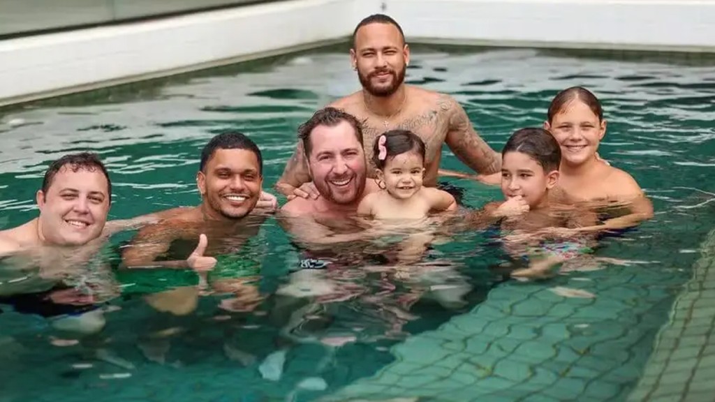 O jogador Neymar, de 31 anos, compartilhou, nesta sexta-feira (22), um clique de um dia de piscina com o filho Davi Lucca e amigos, como Cris Guedes, pai de sua afilhada, Antonella, que também entrou na água.