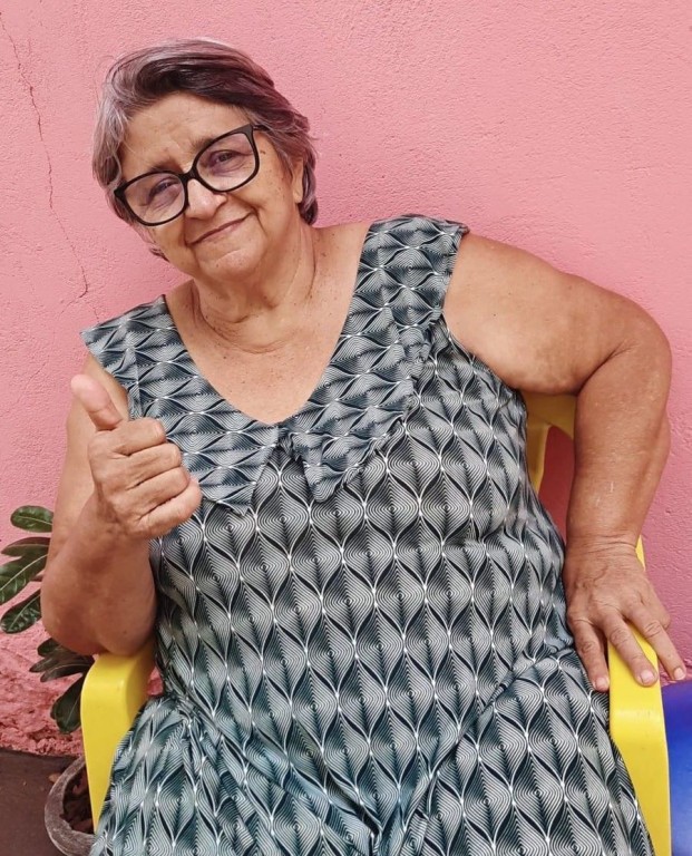 Descrição de imagem: foto vertical colorida de dona Elza sentada olhando para a câmera e sorrindo. Ela é uma mulher branca, com cabelos grisalhos e usa óculos.