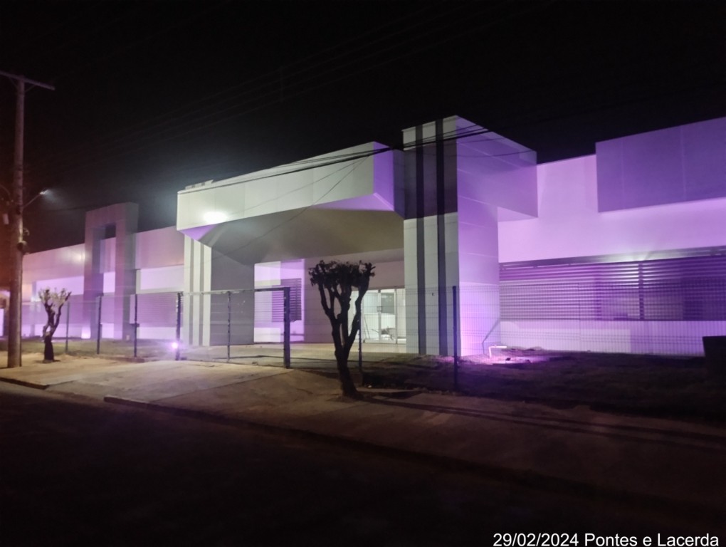 #Paratodosverem. Esta matéria possui recursos de texto alternativo para promover a inclusão das pessoas com deficiência visual. Descrição da imagem: foto horizontal colorida da fachada do prédio do fórum reformado. O edifício é horizontal, com blocos de concreto e pilares de metal, em tons de cinza, e está iluminado com uma luz lilás. Há duas pequenas árvores na frente e o cenário é noturno..